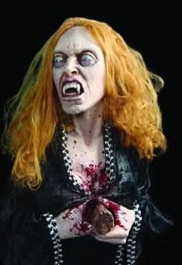 After hundreds of years, sucking dry countless victims, this bloodthirsty imp finally got what she deserves; a wooden stake, right through the heart. As she’s about to drift back to Satan on an express ferry down the river Styx, she moans and groans with a frightened desperation. Struggling to rip this splendid splinter from her chest, her violent writhing draws a crowd of curios onlookers. One vampire down, thousands left to go. It’s nice to see the good guys get one for a change. The Blood Thirsty Vampire Halloween animatronic is perfect for a haunted house or holiday display centered around the popular vampire hunter theme. Custom made from high-quality materials, she’ll be a valued attraction, year after year. Gaze into her agonized eyes as she nears a slow and painful death. Crafted and hand painted by inspired artists at The Horror Dome, she features unsettlingly realistic detail and lifelike motion.