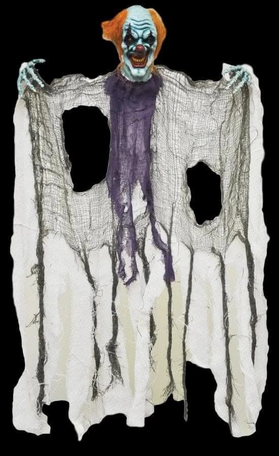 The Hanging Devil Clown Halloween decoration is 36 inches long, and features a lifelike vinyl head and wonderfully sculpted plastic hands. He has blueish pale skin, deranged clown makeup, tufts of orange hair, piercing eyes and a menacing smile full of rotted, yet sharp-looking teeth.