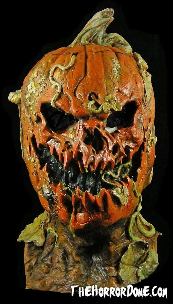 Something stinks in the pumpkin patch. Forgotten by the farmer and left there to rot, this menacing squash has a devilish plot. Slipping from tree to tree, virtually undetectable in the darkness, the Evil Pumpkin prepares to pounce on his prey. Driven by an unquenchable thirst for blood and flesh, this psychotic plant is picking off the townspeople, one by one. From sweet, fatty buttocks, to bitter chunks of liver, he savors every bite of his nightly feast. This classic symbol of the season has come to life in a frightening way. The Evil Pumpkin Halloween mask from The Horror Dome is a movie-quality products that will make an unforgettable fiendish costume and a welcome addition to any collection of macabre merchandise. This possessed Jack O’Lantern is an over the head mask that will look fantastic with a old, tattered top coat, a buttoned-up flannel shirt, or a burlap sack.