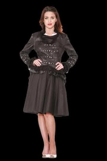 Our stunning jacket is made from a luxurious brocade fabric and features a scooped V-neck collar with with lace trim.Military style metal button detail on the front and sleeves.Bell sleeves with lace and ruffle trim.The back of the coat has a criss-cross lace up style with long coat tail with lace ruffle trim.Β