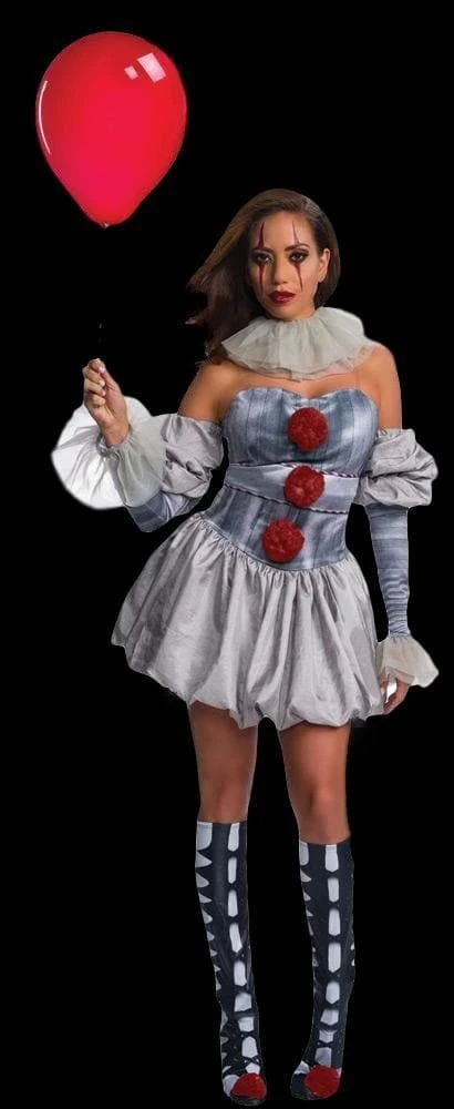 This Deluxe Pennywise Costume includes a dress, collar, and boot covers.