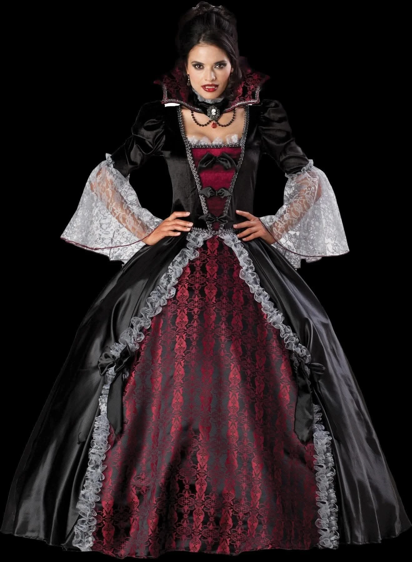 Full length ball gown finished with bat bow accents, full structured petticoat and vampiress choker collar with skull cameo. ADULT SIZE